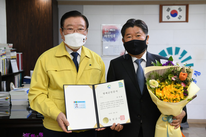 충남 홍성군은 최건환 경주리조트 대표이사에게 최근 명예군민증을 전달했다. 최 대표이사는 광천읍 출신으로 지역 발전을 위해 애쓰고 꾸준한 기부활동을 이어오는 등 군정 발전을 위해 노력한 공로를 인정받았다. 사진은 이날 김석환 군수(왼쪽)가 최 대표이사에게 명예군민증을 전달한 후 기념촬영을 하는 모습. (사진제공=홍성군청)