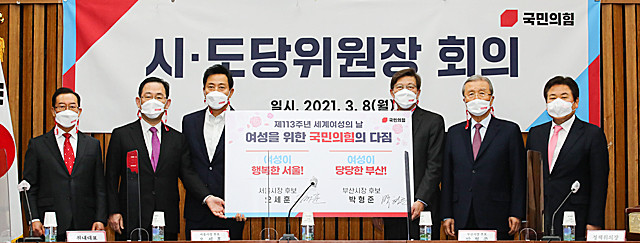 국민의힘은 8일 오전 국회에서 서울·부산시장 주자들이 참석한 가운데 ‘여성이 행복한 서울! 여성이 당당한 부산!’ 서약식을 열어 여성 친화적인 공약과 정책들을 반드시 이행하겠다고 약속했다. 오세훈 서울시장 후보는 선언문에서 국공립 어린이집 확충, 여성 안심주택 공급, 여성 비대면 탄력 근무 활성화 등을 공약했다. 오 후보는 이 자리에서 “‘성추행당’ 민주당의 후보 두 분을 관찰해보면 절절한 진심이 담긴 반성의 목소리는 없었다고 평가한다”고 비판했다. 박형준 부산시장 후보는 저출산 등 여성 정책 총괄부서 설치, 여성 부시장 추진, 고위공직자 성폭력센터 설치 등을 언급했다. 박 후보는 “이번 선거는 정의를 바로 세우는 선거”라며 “부끄러움을 모르는 게 이 정권의 가장 큰 문제”라고 꼬집었다.