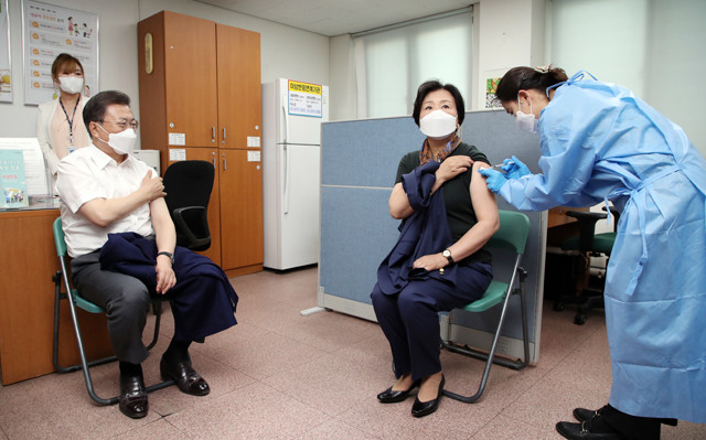 문재인 대통령과 부인 김정숙 여사는 23일 오전 서울 종로구 보건소에서 아스트라제네카(AZ) 백신을 접종했다. 이날은 만 65세 이상을 대상으로 아스트라제네카 백신 접종이 이뤄지는 첫날로, 문 대통령은 만 68세, 김 여사는 만 66세다. 문 대통령과 김 여사는 오전 9시 종로구 보건소에 도착해 체온 측정과 신분 확인, 예진을 마친 뒤 백신 접종을 받았다.