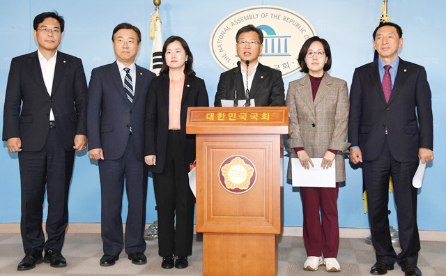 초선의원들이 7 오후 국회 정론관에서 당내 인적 쇄신과 보수통합을 촉구하는 성명서를 발표하고 있다. 왼쪽부터 송언석·김종섭·신보라·이양수·김현아·김석기 의원.