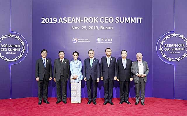 대통령이 25 부산 벡스코에서 열린 CEO 서밋’개막식에서 주요 참석자들과 기념촬영을 하고 있다. 대통령은 기조연설에서 “한반도 평화는 동아시아의 평화”라며 “제3 북미 정상회담 앞으로 남아있는 고비를 넘는다면, 동아시아는 진정한 하나의 공동체로 거듭날 것”이라면서 지지를 당부했다. 왼쪽부터 성윤모 산업통상자원부 장관, 통룬 시술릿 라오스 총리, 아웅산 수치 미얀마 국가고문, 대통령, 쁘라윳 짠오차 태국 총리, 박용만 대한상의 회장, 로저스 로저스홀딩스 회장.