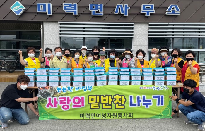 전남 보성군 미력면 여성자원봉사회가 최근 코로나19 극복을 위한 사랑의 밑반찬 나눔 봉사를 펼쳤다. 이날 회원들은 코로나19 장기화로 외출을 자제하고 어렵게 생활하고 있는 취약계층 및 홀몸노인 등 50가구에 정성을 담아 만든 사랑의 밑반찬(열무김치, 양파장아찌)을 전달했다. 사진은 봉사자들이 기념촬영을 하는 모습. (사진제공=보성군청)