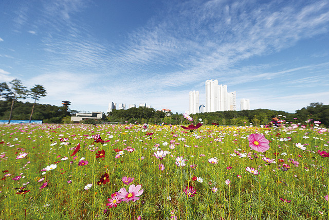 경기도 수원시 영통구 광교호수공원에 활짝 코스모스가 파란 가을 하늘과 어우러져 있다.
