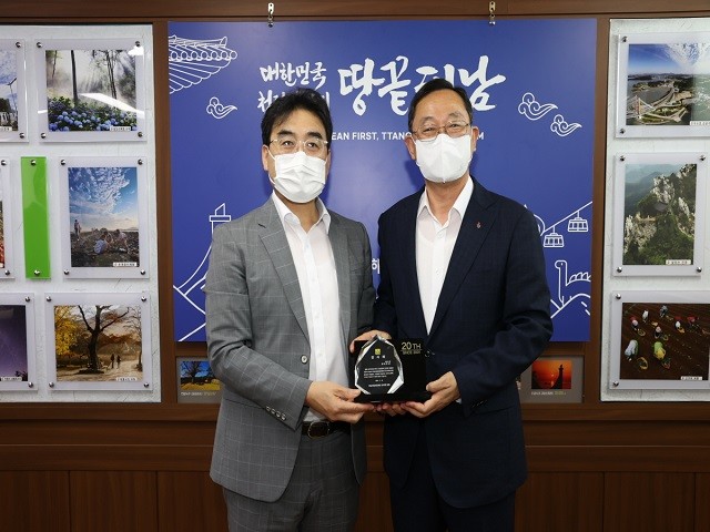 | ▲ 명현관 해남군수(우측)가 소상공인 지원 활성화 노력과 성과를 인정받아 정양수 전남신용보증재단 이사장으로부터 감사패를 받고 기념촬영을 하고 있다. / 사진=해남군 제공 |