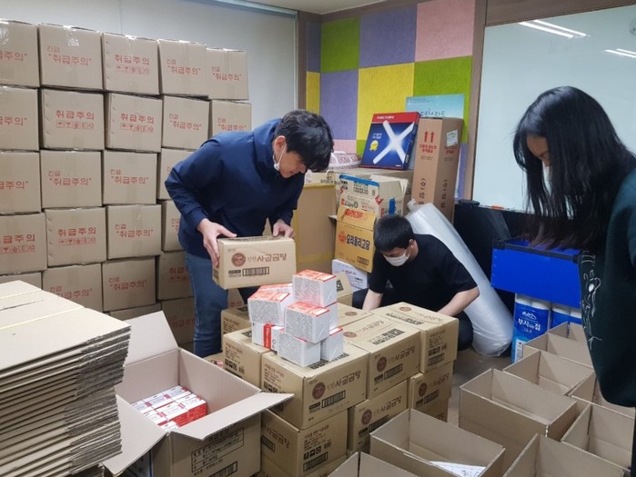 경기 여주시 중앙동행정복지센터가 최근 동 기관 및 단체 8곳에서 손 소독제, 식품 등으로 구성해 포장한 '코로나19 극복 꾸러미'를 지역내 취약계층 170가구에 방문해 전달하고 안전수칙을 안내했다. 사진은 꾸러미를 포장하고 있는 모습. (사진제공=여주시청)