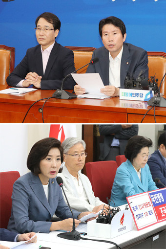 이인영 원내대표가 27 오전 국회에서 열린 원내대책회의에서 발언하고 있다. 자유한국당 나경원 원내대표(왼쪽 두번째) 27 오전 국회 원내대표실에서 조국(법무부 장관 후보자) 인사청문회 대책TF 7차회의를 주재하고 있다.