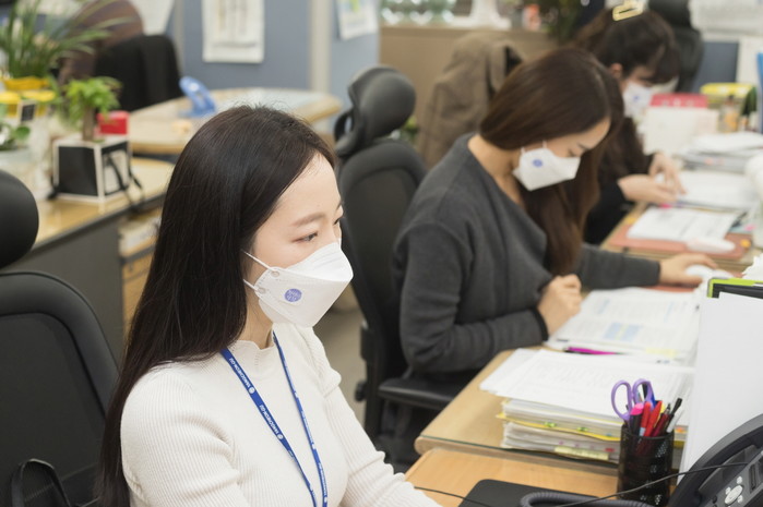 서울 양천구는 설 명절을 맞이해 ‘청렴 양천 실천주간’을 설정했다. 청렴 양천 실천주간에는 마스크 아로마 패치를 제작해 구청, 동주민센터 등 전직원에게 배부했으며, 패치를 부착함으로써 설 명절을 맞이하는 직원의 청렴 의지를 전달했다. 사진은 청렴 마스크 패치 부착하고 근무하는 직원들의 모습. (사진제공=양천구청)