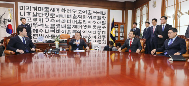 이인영 원내대표(왼쪽부터), 문희상 국회의장, 자유한국당 심재철 신임 원내대표, 바른미래당 오신환 원내대표가 9 국회 의장실에서 만나고 있다.
