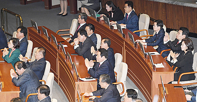 원내대표 자유한국당 의원들이 22 국회 본회의장에서 문재인 대통령 내년도 예산안에 대한 시정연설 도중 손으로 엑스자 모양을 만들고 있다.