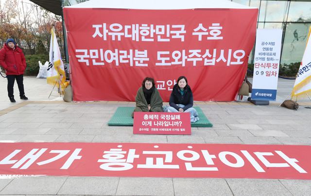 정미경(왼쪽)·신보라 최고위원이 28 오전 청와대 황교안 대표 단식농성장에서 동조 단식을 하고 있다. 대표는 단식 8일째인 전날 의식을 잃고 신촌 세브란스병원으로 옮겨졌으며, 현재 의식을 회복한 상태다.