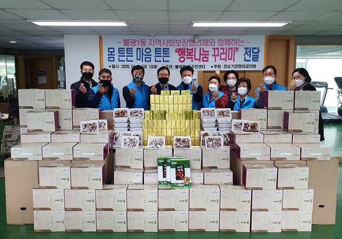 서울 은평구 불광1동지역사회보장협의체는 최근 저소득 빈곤위기가구를 위한 몸 튼튼, 마음 튼튼 '행복나눔 꾸러미' 전달행사를 개최했다. 이번 행사에는 정승기정형외과의원에서 후원한 비타민 100세트와 함께 제육볶음과 김세트가 포함된 꾸러미를 각 가정에 배달했다. 사진은 전달식에서 관계자들이 기념촬영을 하는 모습. (사진제공=은평구청)