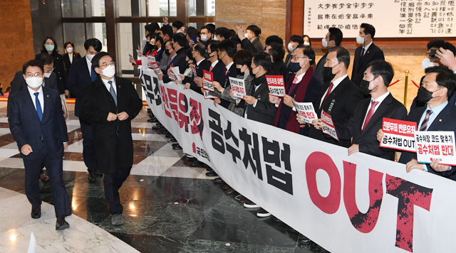 국민의힘 의원들이 9일 국회 본회의장 입구에서 본회의에 참석하는 여당 의원들을 향해 공수처법 저지 등이 적힌 손팻말을 들어보이고 있다.