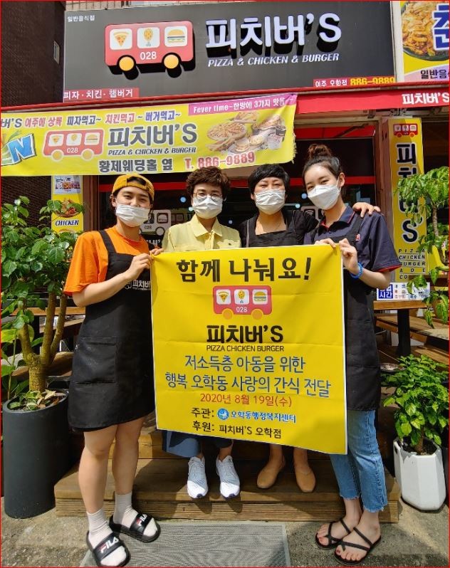 경기 여주시 오학동 행정복지센터는 최근 '피치버’S 여주점'으로부터 아동을 위한 사랑의 간식(햄버거와 음료)을 후원받았다. 사랑의 간식은 오학동내 저소득층 가정 초·중·고생 아동 250명에게 SNS 문자로 발송됐다. 사진은 전달식에서 기념촬영하고 있는 모습. (사진제공=여주시청)