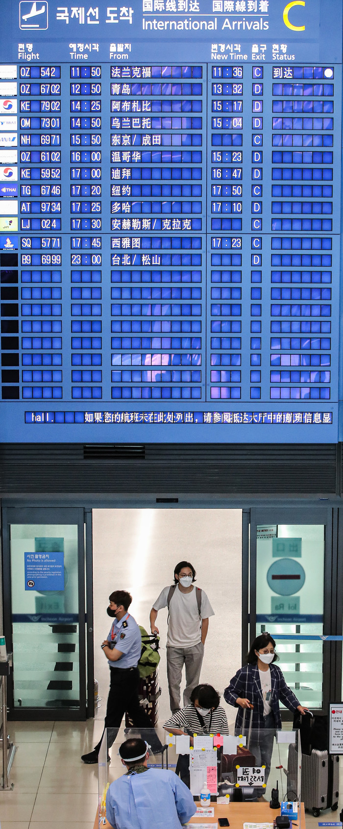 26일 오후 인천공항 입국장에서 독일 프랑크푸르트에서 입국한 입국자들이 입국장에 들어서고 있다. 코로나19 델타형 변이로 인한 감염자가 전 세계적으로 급증하고 있는 가운데, 해외 입국자 방역에도 비상이 걸렸다.