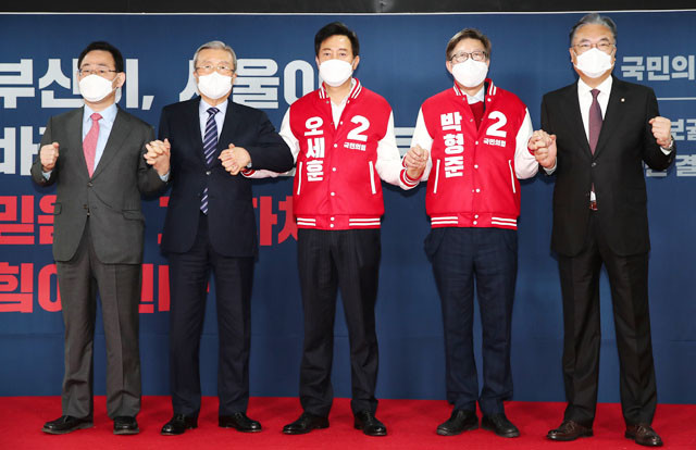 국민의힘 서울시장 후보로 선출된 오세훈 전 서울시장과 부산시장 후보로 선출된 박형준 전 의원이 4일 오전 서울 여의도 국민의힘 중앙당사에서 열린 4.7 보궐선거 서울·부산시장 후보 경선 결과 발표회에서 당지도부와 손을 맞잡고 인사하고 있다. 왼쪽부터 주호영 원내대표, 김종인 비상대책위원장, 오 후보, 박 후보, 정진석 공천관리위원장.