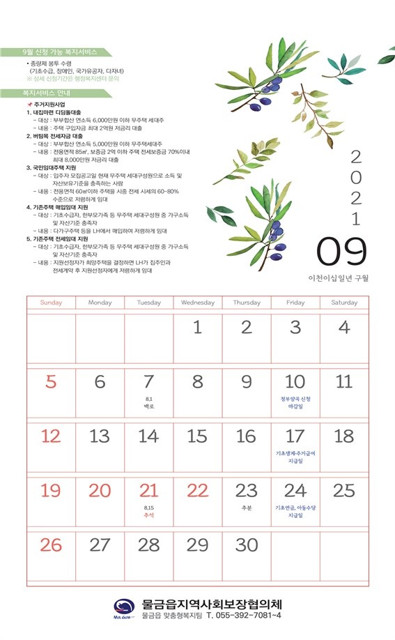 달력에는 복지 대상자들도 쉽게 알 수 있도록 월별 주요 서비스 신청일과 복지 급여일이 적혀있으며 관련 기관들의 연락처도 담겨 있어 연중 상시 복지사각지대 발굴 홍보효과를 극대화하고 복지 접근성 향상에 많은 도움이 될 것으로 예상된다.