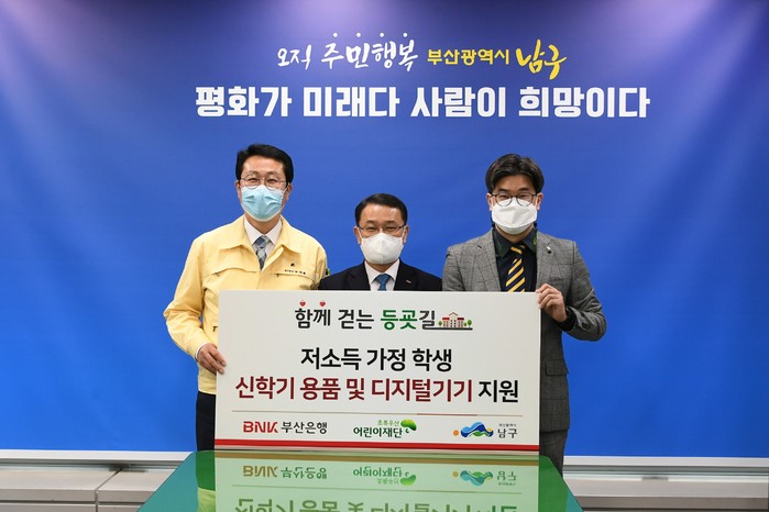 [시민일보 = 여영준 기자] BNK부산은행이 11일 오후 부산 남구청에서 부산 남구청, 초록우산어린이재단과 신학기 지원사업 ‘함께 걷는 등굣길’ 전달식을 갖고 지역 저소득가정 학생에 신학기 용품을 지원하기로 했다.