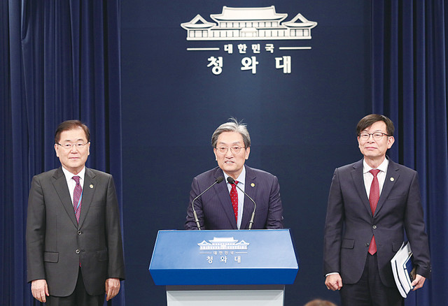 청와대 노영민 대통령 비서실장(가운데)이 10일 오후 춘추관 대브리핑룸에서 열린 기자간담회에 앞서 모두발언하고 있다. 왼쪽은 정의용 국가안보실장, 오른쪽은 김상조 정책실장.   /연합뉴스