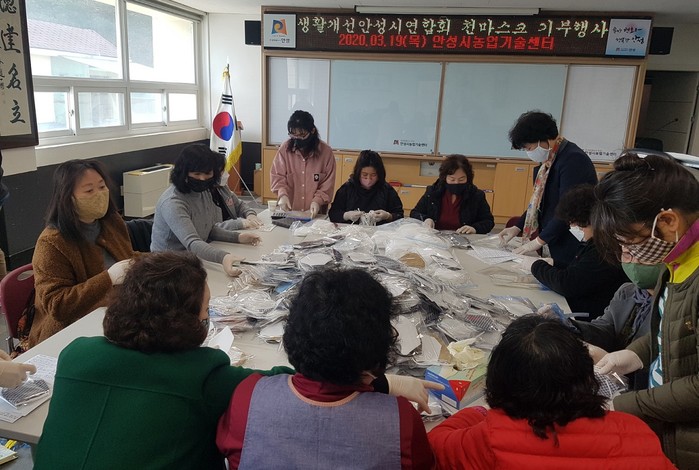 '생활개선안성시연합회'가 19일 천마스크를 만들어 기부하는 활동에 동참했다. 이번 기부행사를 연 생활개선안성시연합회는 경기 안성시농업기술센터에서 운영하고 있는 여성농업인단체로 노인 목욕 봉사 및 점심식사 봉사, 환경운동 등의 활동을 매년 진행하고 있다. 사진은 연합회 관계자들이 마스크를 만들고 있는 모습.(사진제공=안성시청)