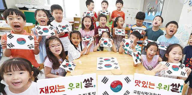 이틀 앞둔 13 오전 경기도 수원시 권선구의 유치원에서 어린이들이 우리 점토로 만든 태극기를 들고 있다.