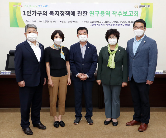 [시민일보 = 홍덕표 기자] 서울 강북구의회(의장 이용균) 1인 가구를 위한 정책개발 의원연구모임이 최근 구의회 3층 의원회의실에서 '1인 가구 및 1인 노인가구의 복지정책에 관한 연구용역'을 위한 착수보고회를 개최했다.