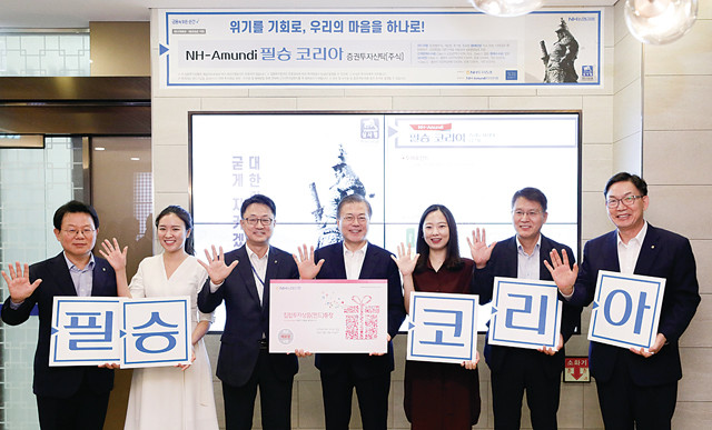 대통령이 26 오전 중구 NH농협은행 본점에서 직원들과 간담회 기념촬영을 하고 있다. 왼쪽은 김광수 NH농협금융지주 회장, 오른쪽은 이대훈 농협은행장. 이날 대통령은 소재·부품·장비 분야 국내 중소기업에 투자하는 ‘필승 코리아 펀드’에 가입했다.