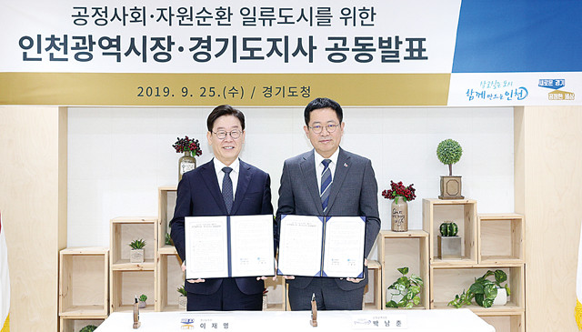 박남춘 인천시장(오른쪽) 이재명 경기도지사가 '공정사회ㆍ자원순환 일류도시를 위한 경기도지사, 인천광역시장 공동 발표문' 서명한 기념촬영을 하고 있다.