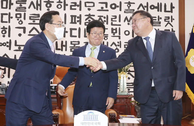 더불어민주당 김태년 원내대표(오른쪽)와 미래통합당 주호영 원내대표(왼쪽)가 11일 오전 서울 여의도 국회 국회의장실에서 열린 21대 국회 전반기 원구성 협상을 위한 국회의장 주재 원내대표 회동에서 악수하고 있다. 가운데는 박병석 국회의장.