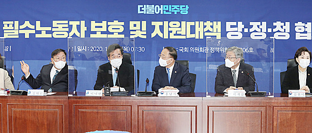 더불어민주당 이낙연 대표와 김태년 원내대표, 홍남기 경제부총리, 이재갑 고용노동부 장관, 김현미 국토교통부 장관 등이 12일 오전 국회 의원회관에서 열린 필수노동자 보호 및 지원대책 당정청 협의회에서 대화를 하고 있다.
