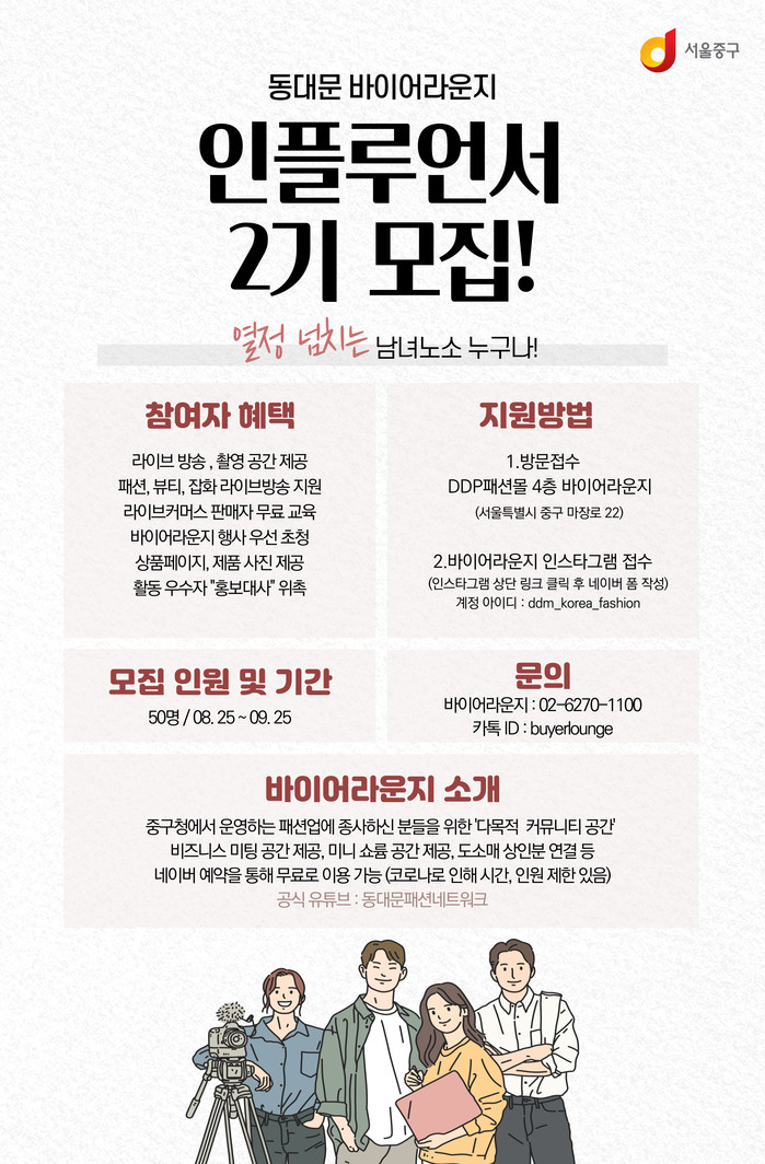 [시민일보 = 여영준 기자] 중구(구청장 서양호)는 동대문 패션 활성화를 위한 ‘동대문 바이어라운지’ 인플루언서 2기를 25일~9월25일 모집한다고 밝혔다.