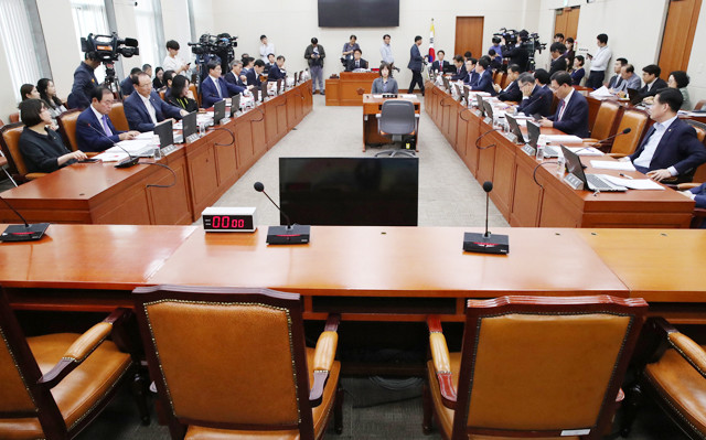 국회에서 열린 정무위원회 전체회의에서 여야 의원들이 국감 증인 채택을 놓고 공방을 벌이고 있다.