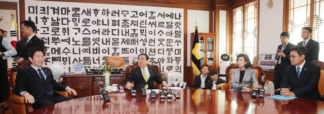 국회의장이 28 오전 국회에서 교섭단체 원내대표들과 회동하고 있다. 왼쪽부터 더불어민주당 이인영 원내대표, 의장, 자유한국당 나경원, 바른미래당 오신환 원내대표.