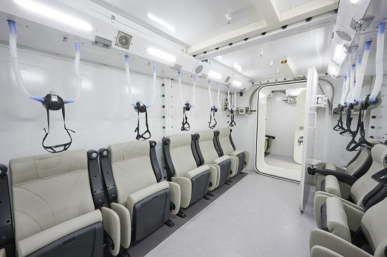 또한 챔버 내부 양쪽 벽 끝에 붙어 있는 접이식 의자는 고압산소챔버를 상징하는 밝은 아이보리 컬러와 걸맞은 신식 의자로 인테리어 되어 심미성이 돋보이는 제품이다. 환자의 시선에서는 넓은 시야가 확보되기 때문에 심리적으로 안정되고 편안하게 고압산소치료를 경험할 수 있다는 특징이 있다.