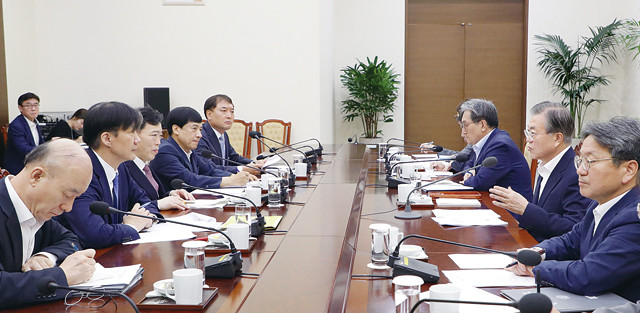 대통령이 30 오전 청와대 여민관에서 조국 법무부 장관의 업무보고를 받고 있다.