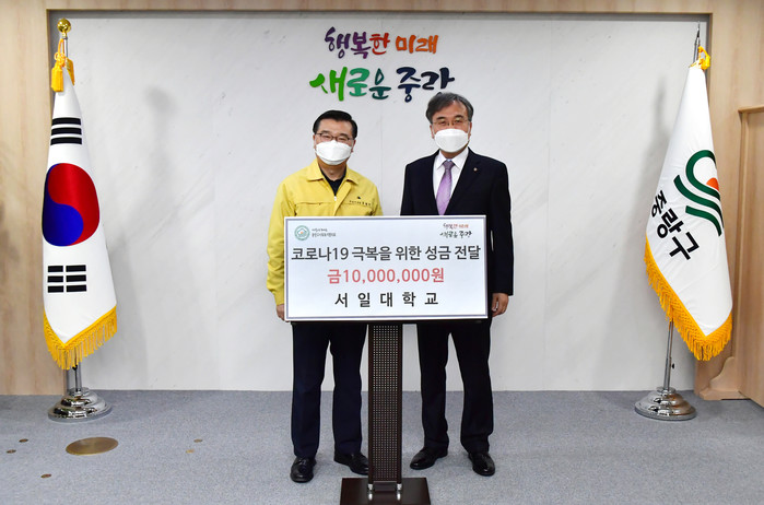 서울 중랑구는 19일 서일대학교로부터 코로나19 극복을 위한 성금 1000만원을 전달받았다. 이날 전달식에는 류경기 구청장, 우태희 총장직무대행 등 6명이 참석했다. 사진은 류 구청장(왼쪽)이 우 총장직무대행과 기념촬영을 하는 모습.(사진제공=중랑구청)