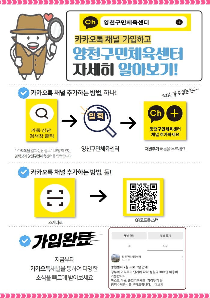 [시민일보 = 이대우 기자] 양천구시설관리공단 양천구민체육센터에서는 ‘카카오톡채널’을 개설했다고 28일 밝혔다.