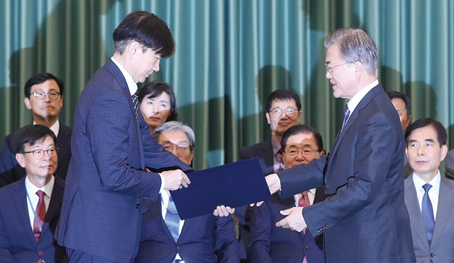 대통령은 9 “저를 보좌해 저와 함께 권력기관 개혁에 매진하고 성과를 보여준 조국 법무부 장관에게 마무리를 맡기고자 한다”면서 “그 의지가 좌초돼서는 된다고 생각한다”고 말했다. 대통령은 이날 오전 장관을 비롯한 6명의 장관 장관급 후보자에 대한 임명을 재가한 오후에 청와대 충무실에서 열린 임명장 수여식에서 이같이 밝혔다.