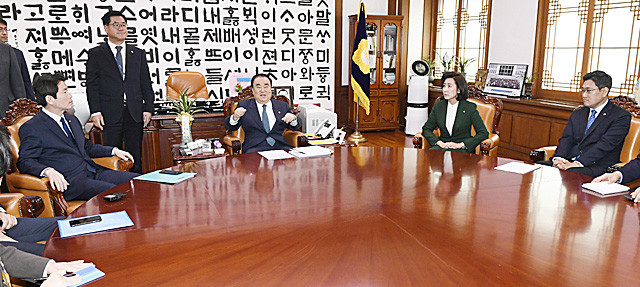국회의장이 12 오전 국회에서 교섭단체 원내대표들과 회동하고 있다. 왼쪽부터 더불어민주당 이인영 원내대표, 의장, 자유한국당 나경원 원내대표, 바른미래당 오신환 원내대표.