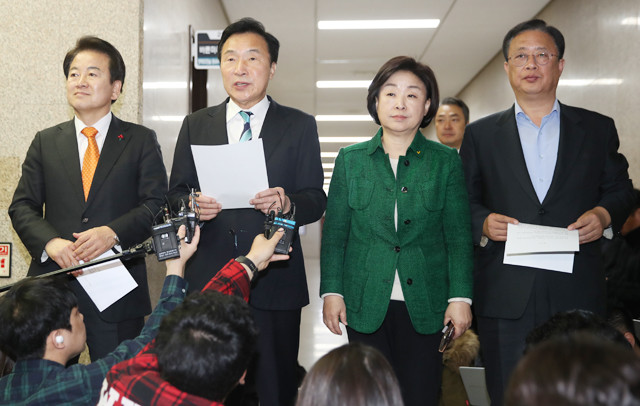 손학규 대표와 야당 대표들이 23 오전 서울 여의도 국회에서 석패율제 포기, 민생법안 처리를 위한 본회의 개회 합의안을 발표하고 있다. 민주평화당 정동영 대표(왼쪽부터), 바른미래당 손학규 대표, 정의당 심상정 대표, 대안신당 유성엽 창당준비위원장.