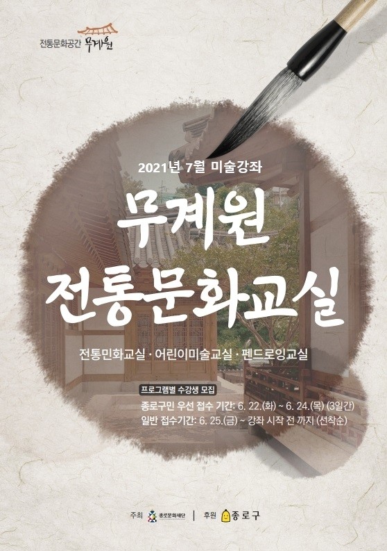 [시민일보 = 이대우 기자] 서울 종로구(구청장 김영종)는 부암동 전통문화공간 무계원(창의문로5가길 2)에서 7월 한 달간 「전통문화교실 미술강좌」를 운영한다.