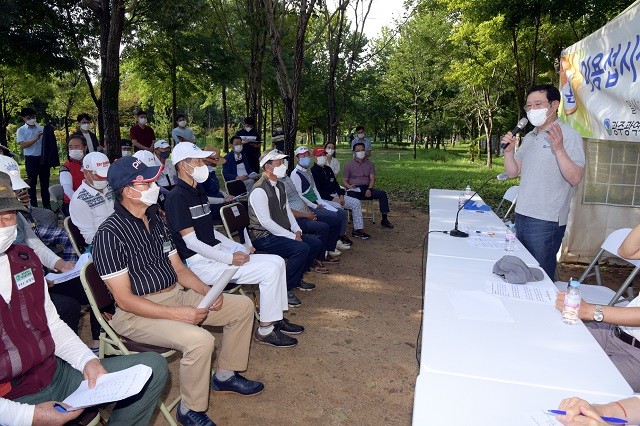 [광주=정찬남 기자] 이용섭 광주광역시장이 지난 28일 오전 첨단대상파크골프장을 방문해 이용 시민들과 간담회를 갖고 애로 및 건의사항을 듣고 있다.
