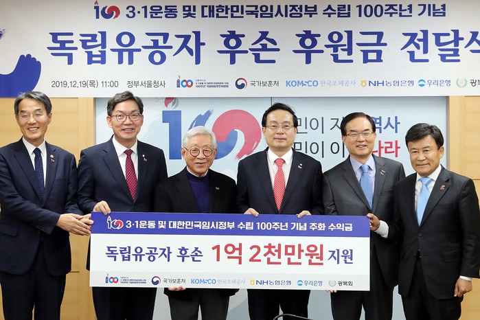 [시민일보 = 황혜빈 기자] 우리은행은 19일 정부서울청사 3층 대회의실에서 대통령직속 3.1운동 및 대한민국임시정부 수립 100주년을 맞이해 기념사업추진위원회, 국가보훈처, 광복회, 한국조폐공사, NH농협은행과 함께 ‘독립유공자 후손 후원금 전달식’을 개최했다고 밝혔다.