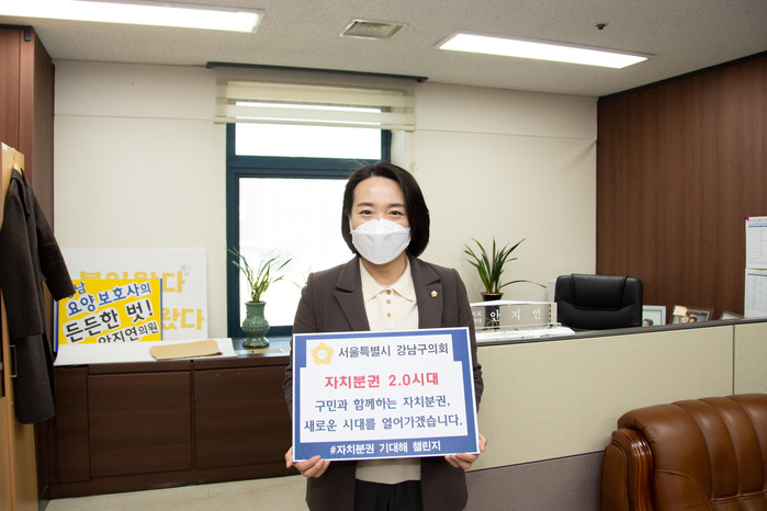 [시민일보 = 이대우 기자] 서울 강남구의회 안지연 의원(논현2동, 역삼1·2동)이 10일 '자치분권 기대해 챌린지' 캠페인에 동참했다.