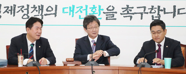 비당권파 모임인 ‘변화와 혁신을 위한 비상행동’(변혁) 대표인 유승민 의원(가운데) 14 오전 국회에서 열린 비상회의에서 시간을 확인하고 있다.