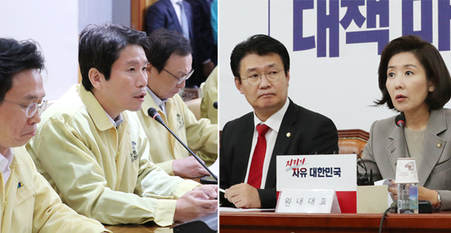 이인영 원내대표가 23 오후 경기도 양평군의 아프리카돼지열병(ASF) 방역대책 상황실을 방문, 발언하고 있다(왼쪽). 자유한국당 나경원 원내대표도 이날 국회에서 열린 ‘아프리카 돼지열병(ASF) 대책마련을 위한 TF회의’에서 발언하고 있다.