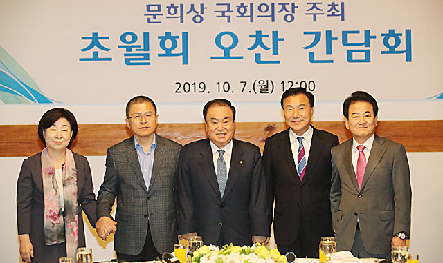 국회의장과 4 대표들이 7 오후 국회 사랑재에서 열린 초월회 오찬 간담회에서 손을 맞잡고 포즈를 취하고 있다. 왼쪽부터 정의당 심상정, 자유한국당 황교안 대표, 의장, 바른미래당 손학규, 민주평화당 정동영 대표. 이날 더불어민주당 이해찬 대표는 참석하지 않았다.