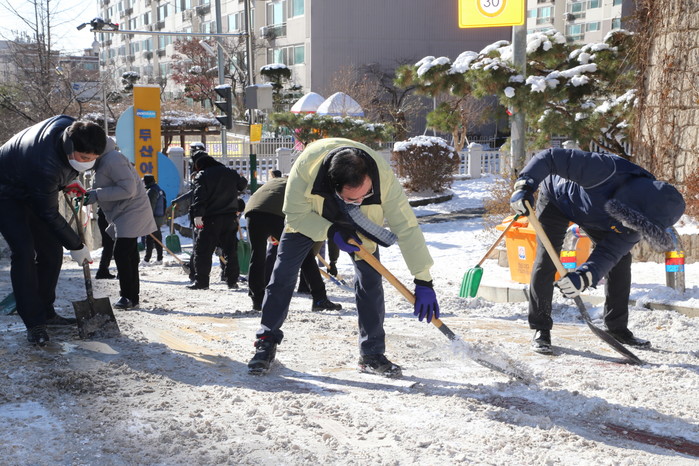 [성남=오왕석 기자] 성남시의회 윤창근 의장과 의회사무국 직원들이 1월 8일 폭설과 한파로 인한 시민 불편을 최소화하기 위해 제설작업에 동참했다.