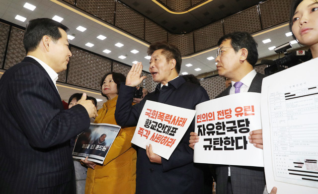 의원과 당직자들이 지난 16 국회 폭력사태와 관련해 17 오전 서울 여의도 국회 본청 로텐더홀의 자유한국당 농성장을 항의방문하고 있다.