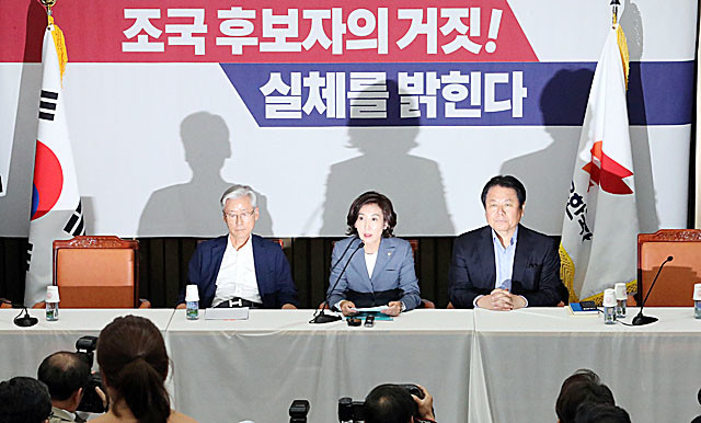 나경원 원내대표가 3 여의도 국회에서 열린 ‘조국 후보자의 거짓과 선동, 대국민 고발 언론 간담회’에서 발언하고 있다. 왼쪽부터 여상규 법제사법 위원장, 원내대표, 정양석 원내수석부대표.