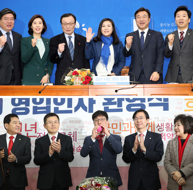 이해찬 대표가 16 오전 서울 여의도 국회 당대표 회의실에서 아홉번째 영입인사인 최지은 세계은행 선임 이코노미스트와 기념촬영을 하고 있다(). 21 총선을 앞두고 자유한국당에 영입된 산업재해 공익신고자 이종헌 (가운데) 16 오전 국회에서 열린 한국당 영입인사 환영식에서 황교안 대표로부터 선물 받은 호루라기를 불고 있다.